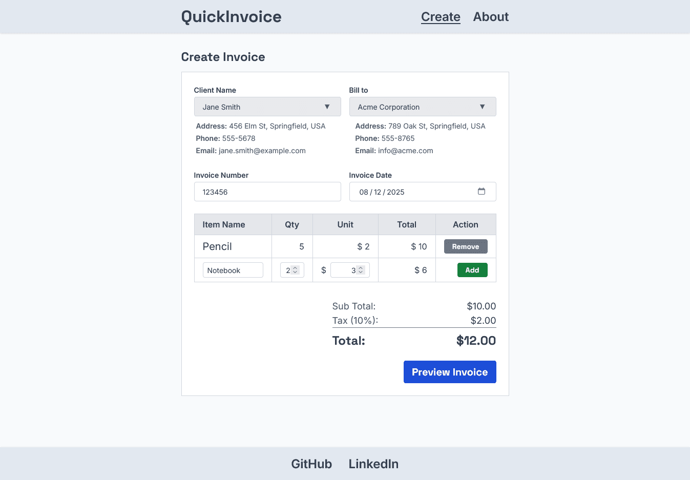 Quick InvoiceVue.js, Pinia, Nuxt.js, TypeScript, Vuex, LightHouse, Wave, Jest, Cypress, TanStack Query, Axios, Tailwind, Storybook, Vercel, Figma, html2pdf.js