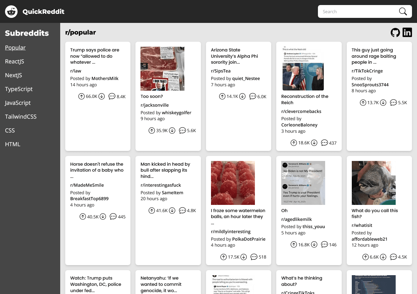 Quick RedditNext.js, React.js, TypeScript, Redux, Jest and RTL, Lighthouse, Reddit API, Figma, Tailwind